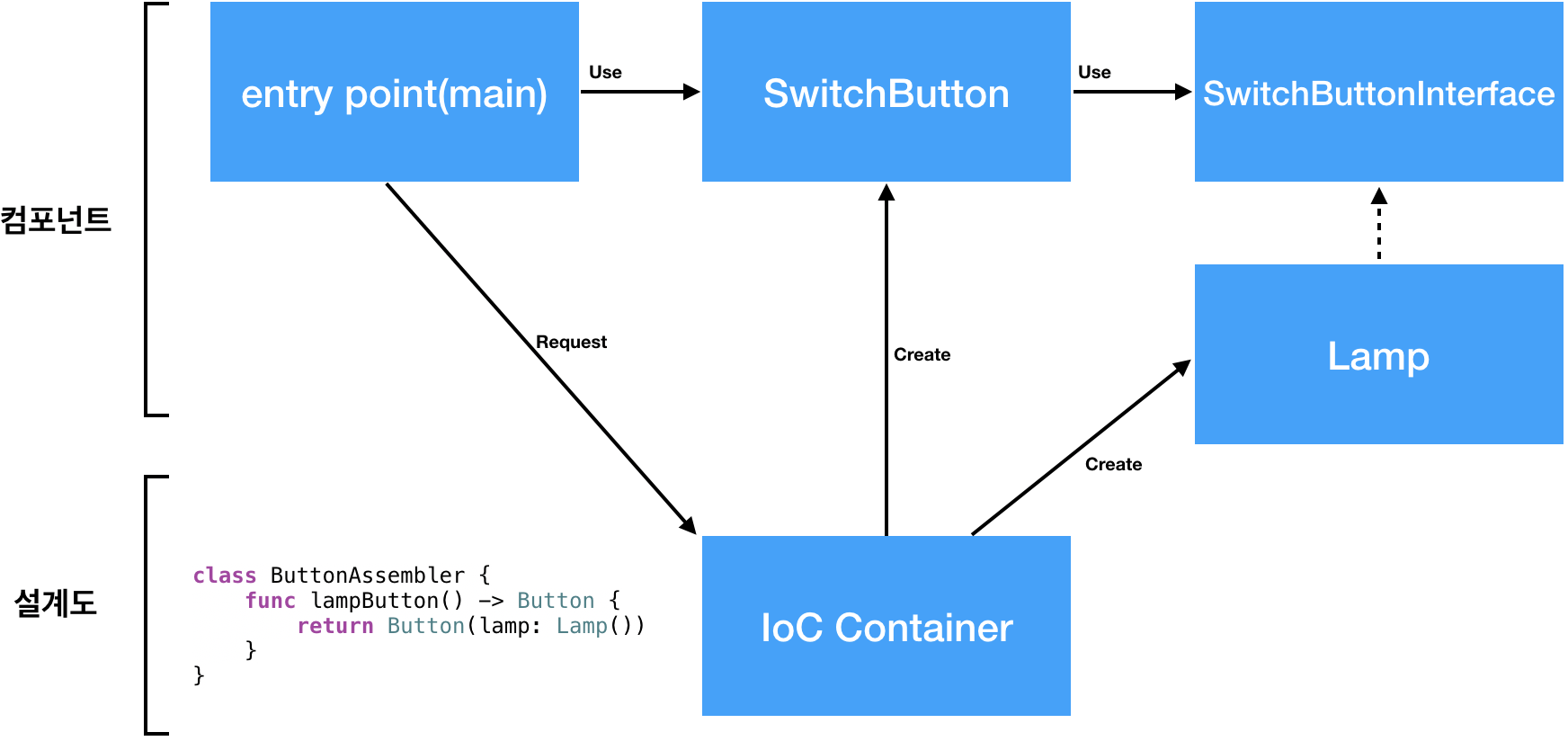[그림 13]은 역전된 제어의 흐름을 보여준다. entry point에서 IoC Container에게 모든 관계 설정에 대한 책임을 위임한다. 따라서 컴파일 타임의 static한 class dependency가 런타임의 dynamic한 object dependency로 변경된 것을 볼 수 있다. [그림 14]는 SwitchButton에 IoC개념이 적용한 모습이다.