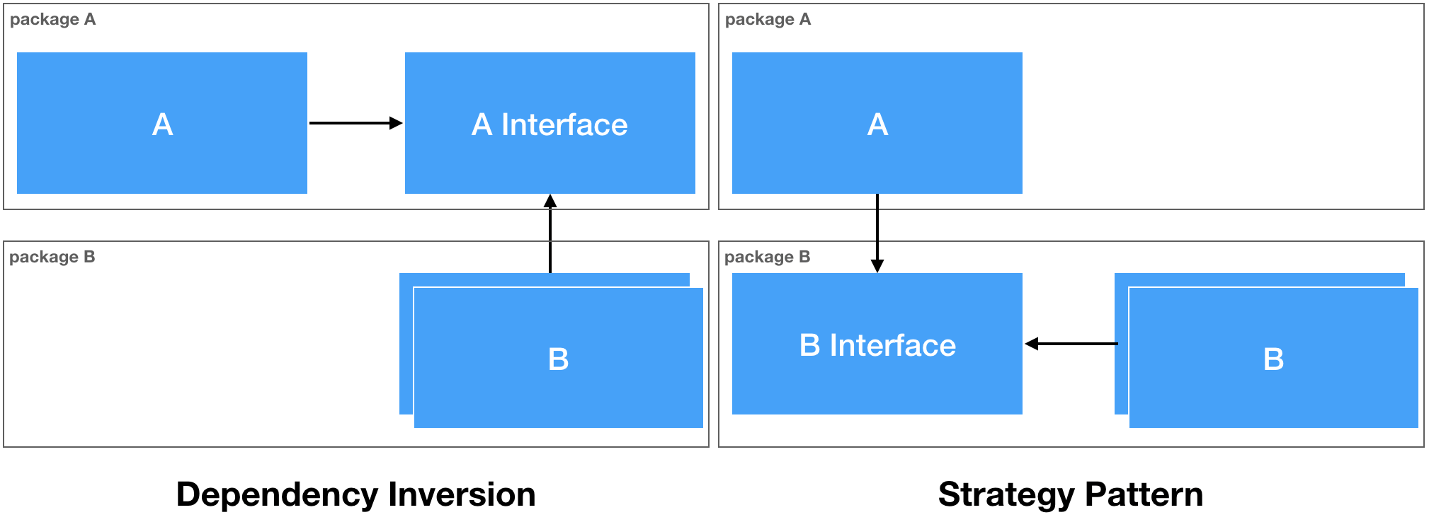 [그림 8]에서 DIP의 Interface는 A에서 정의하고 B에서 구현하고 있다. 하지만, Stractegy Pattern에서는 그 반대다. Interface를 B에서 정의하고 A에서 의존한다.
