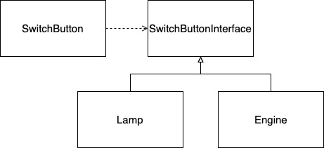 [코드 1]에서는 SwitchButton이 Lamp를 직접적으로 Dependeny하고 있었다. 하지만 [코드 2]에서는 SwitchButton이 Lamp대신 SwitchButtonInterface를 참조하도록 하였고, 각 Lamp와 Engine이 SwitchButtonInterface를 Inherit하도록 하여 Dependency를 Inversion하였다. 따라서 이제 SwitchButton은 Lamp와 같은 구현체와 Dependency가 전혀 없음으로 재사용이 가능한 코드가 되었다.
