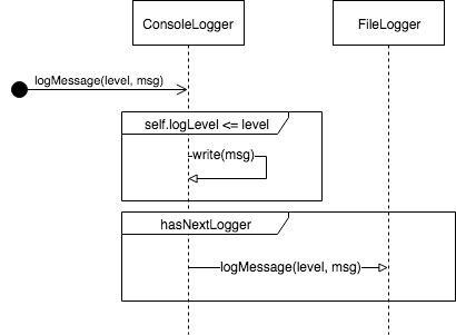 [그림 4]는 특정 조건에 따라 목적 코드를 분기하는 경우다. Chain of Responsibility Pattern의 컨셉은 자신의 조건이 맞으면 수행하고 그렇지 않으면 패스한다. else if로 만들수도 있고 if, if, 조건으로 만드는 등 각 요구사항에 맞게 Varient하여 디자인 하면 된다. [그림 5] 아래는 log level에 따라 각 Logger들이 로깅을 할지 말지를 판단하는 체인을 구현한 예시다.