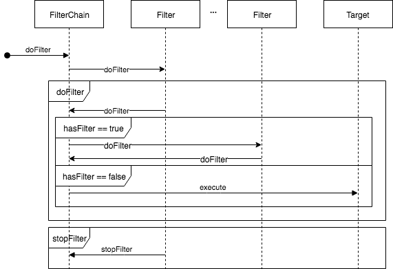 시퀀스는 간단하다. Client는 FilterChain에 target과 filter들을 추가하고 FilterChain.doFilter()를 호출한다. FilterChain은 첫 번째 Filter를 호출하고 호출된 해당 Filter는 주어진 조건을 확인하고 판단하고 다시 FilterChain..doFilter를 호출하면 다음 Filter를 호출하게 되고 FilterChain.stopFilter를 호출하면 중단되며 target은 실행되지 않는다. 모든 filter들이 실행되어 통과되면 target은 그 때 실행될 수 있다. 각 요구사항에 따라 디테일한 동작은 변형하여 디자인 하면 된다. 수도코드를 보면 아래와 같다.